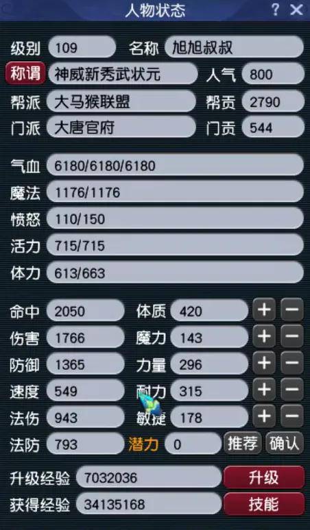 大唐带PK装备的打符面板,具备6180点气血、1766点伤害、1365点防御以及549点速度。攻守兼备的加点方式,可击溃任何阵容。