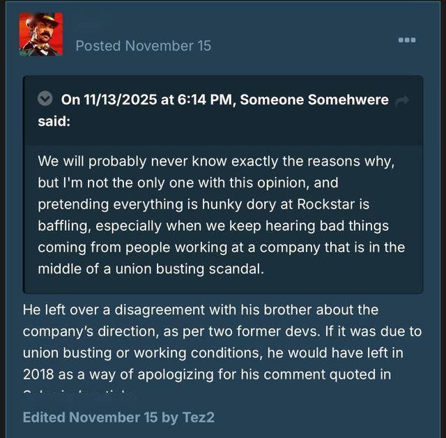 一名网友回复说:“Dan想要的是深度叙事的内容,以保持单人游戏的核心魅力在发售后依然存在,但山姆的愿景却是永远榨干线上模式的每一分钱,如今Rockstar陷入了无休止的GTA式重复劳动中。Rockstar的黄金时代就此终结。”