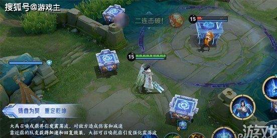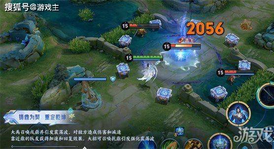 大禹召唤戍鼎并引发震荡波,对敌方造成伤害和减速。靠近鼎的队友获得加速和回复效果,大招可召唤乾鼎引发强化震荡波。