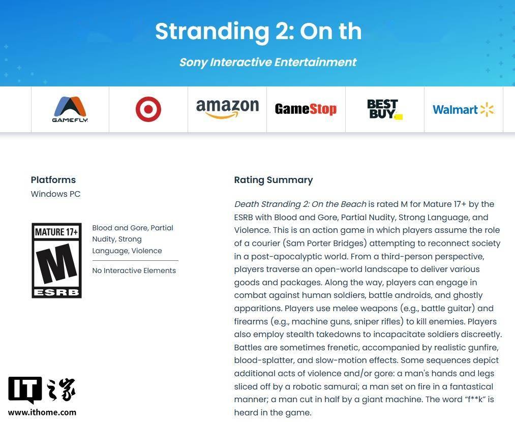 对于玩家期待已久的 Windows PC 版,现已正式通过 ESRB 认证,被评为 M 级(17+)。据介绍,游戏中包含血腥暴力、部分裸露、粗俗语言和暴力内容,甚至游戏中还出现了“f**k”这个词。