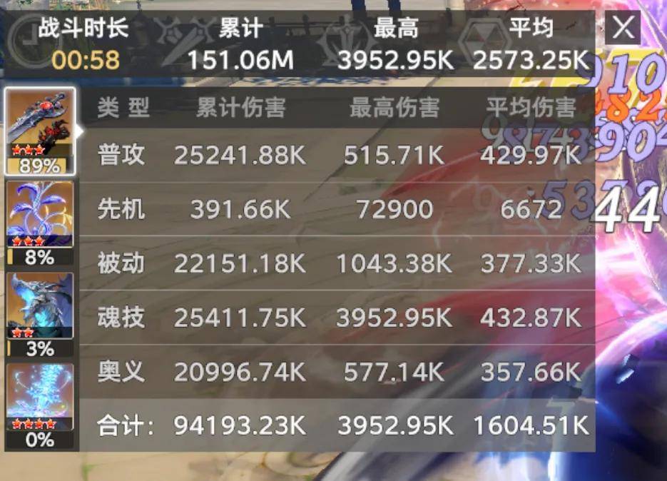 最后莫长歌的3被动主要功能有两个,其一是提供更丰富的“王阴”与“圣阳”的积累途径,其二则是通过一定的条件来高频触发“阴雷”和“阳炎”的伤害,而如果纵观莫长歌1、2、3技能所带来的综合效果,其大致在2轮输出后的伤害占比大家可以参考下边这个摒除了绝大部分暴击率等干扰因素的测试结果,大致普攻、魂技、被动、奥义的伤害占比是非常平均的,这也是莫长歌作为主C状态下的一个特色。