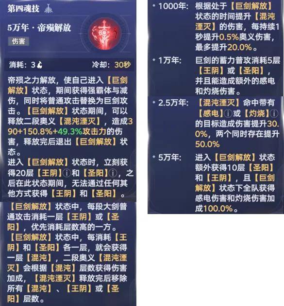 然后我们来说4、5、6技能搭配,其中4奥义不同于1奥义的一点就是它并不会一直持续于“巨剑解放”状态,而放4奥义后咱们还可以接一次二段大招,不过选择放二段大招的实际就比较重要了,因为在4奥义状态持续期间会有一个“混沌”状态的加成,这个混沌状态可以通过消耗“王阴”或“圣阳”状态来积累,或者通过消耗时间来积累,最高可以提升20%的奥义伤害,所以积累到更高的“混沌”层数再来放二段大招就是4奥义的关键。