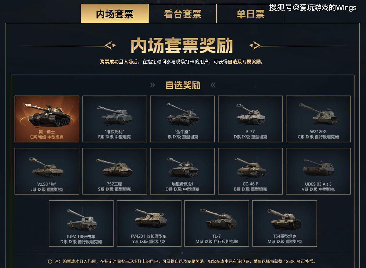 而且每个档位的套票都有不同奖励,买了最高级的内场套票可以自选一台九金坦克;买了看台套票的就有自选的强势八金坦克。至于选择单日看台票也是不亏的,两天两张票意味着可以选两台普通八金/七金,可以说每一个买票来看线下的玩家们都各有斩获。