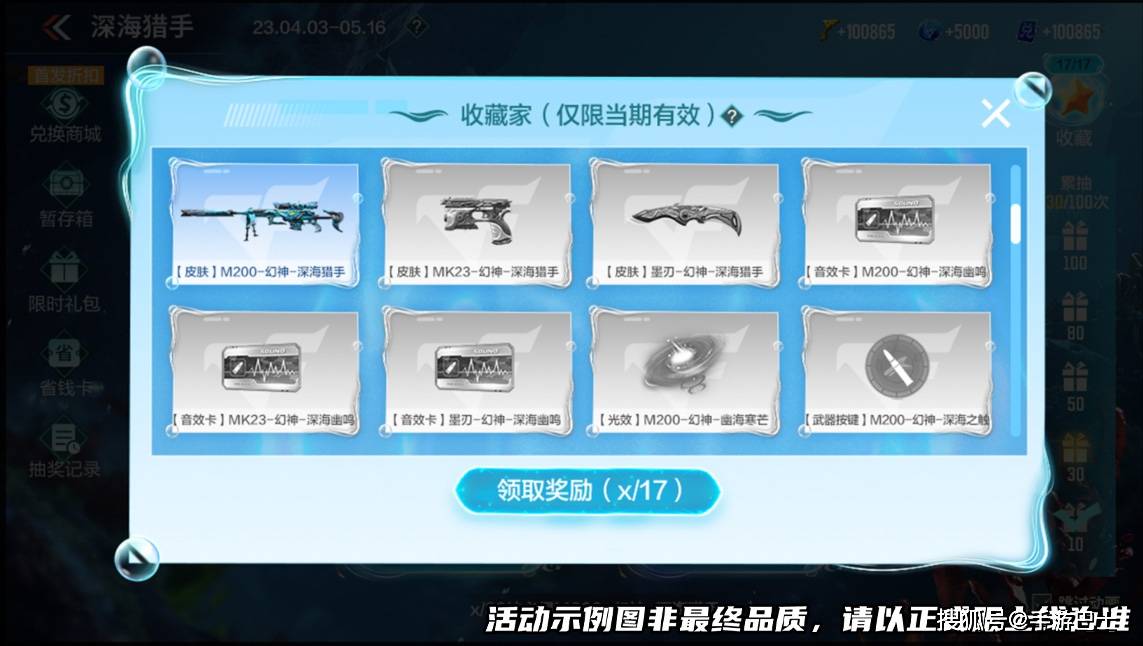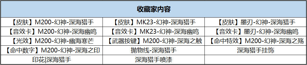 本次活动加入了收藏家系统,在当期活动中,从抽奖或兑换中获取到14件指定道具后,将可以获得额外奖励最终消灭-深海猎手。