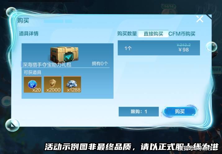 本次深海猎手夺宝活动除了常规的“一元购”活动(1天1枚,累计10天)加持以外,还新增了活动专属98元超值限购礼包,内含:深海猎手夺宝币*20、2000赏金令积分、1288钻石。