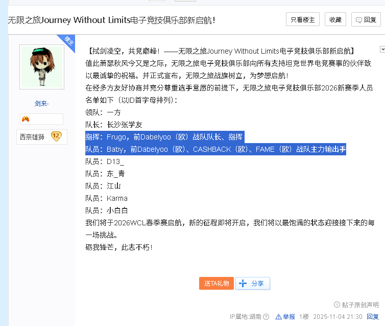 而在11月4日成立的JWL电竞俱乐部就官宣引入两位欧服资深选手——Frugo和Baby。希望欧服选手的到来能带动国服战队基础竞技能力的提升,并更加积极主动的使用战术。