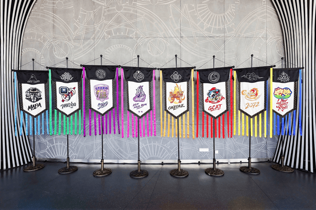 步入场馆内部,苏绣战旗展区绝对是必打卡的亮点。这八面战旗由苏绣大师张雪亲手制作,将硬核电竞与江南非遗完美融合。