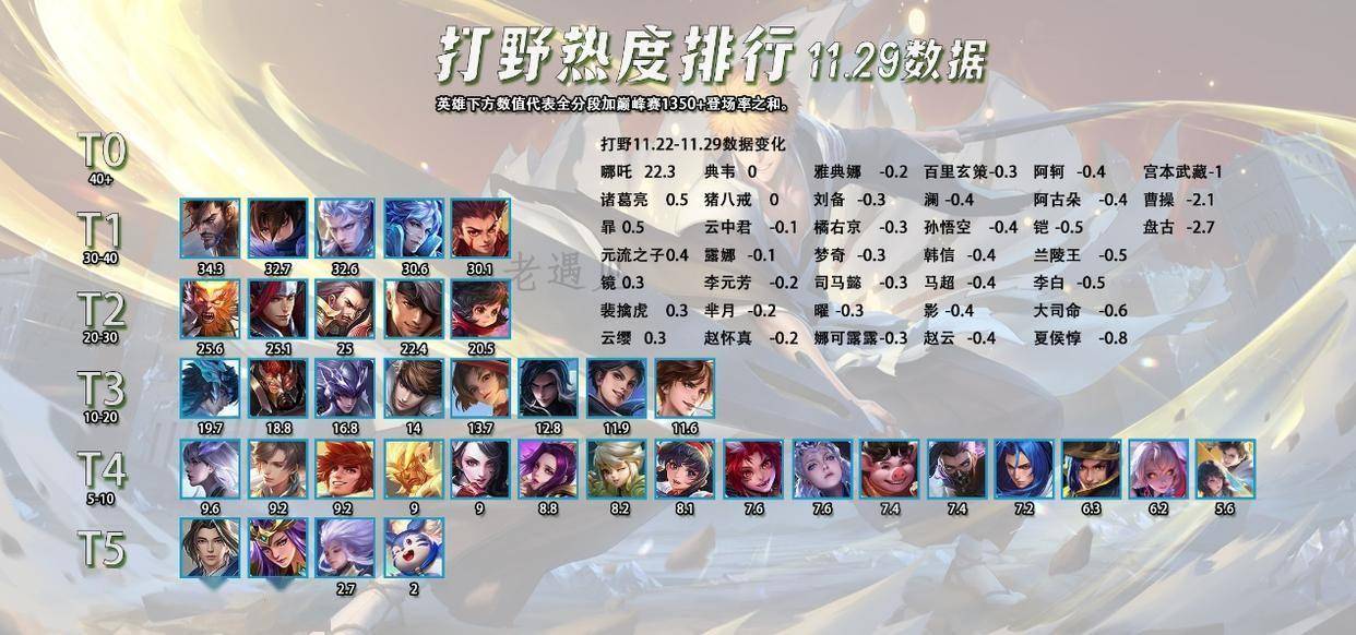 这一周的变化就只有一个,那就是哪吒优化升级后的出场率飙升,现在对于出装铭文和分路还不是特别的清晰,还是处在一个开发阶段。等正式上线一周后会开始统计国服出装铭文,到时候就可以得出比较靠谱的分路和出装。