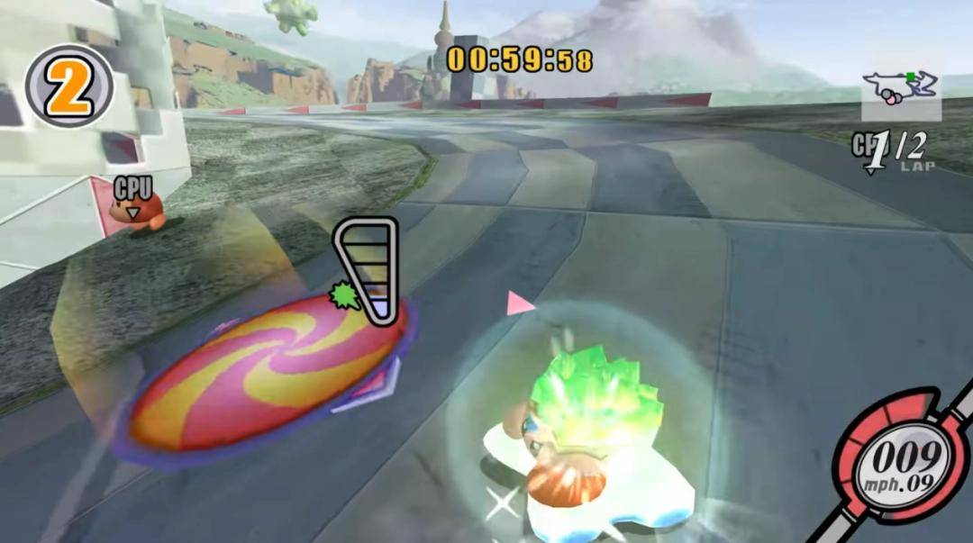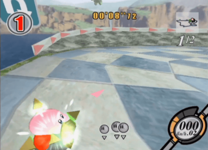 实际上,与其说《卡比的驭天飞行》是一款竞速游戏,不如说它更像一款将角色换成赛车,战场改为赛道的“任天堂明星大乱斗”,而且还是《任天堂明星大乱斗DX》(Melee)——历代作品中最为前卫且过激,“樱井政博风味”最显著,如今看来最为小众变态的那一版。