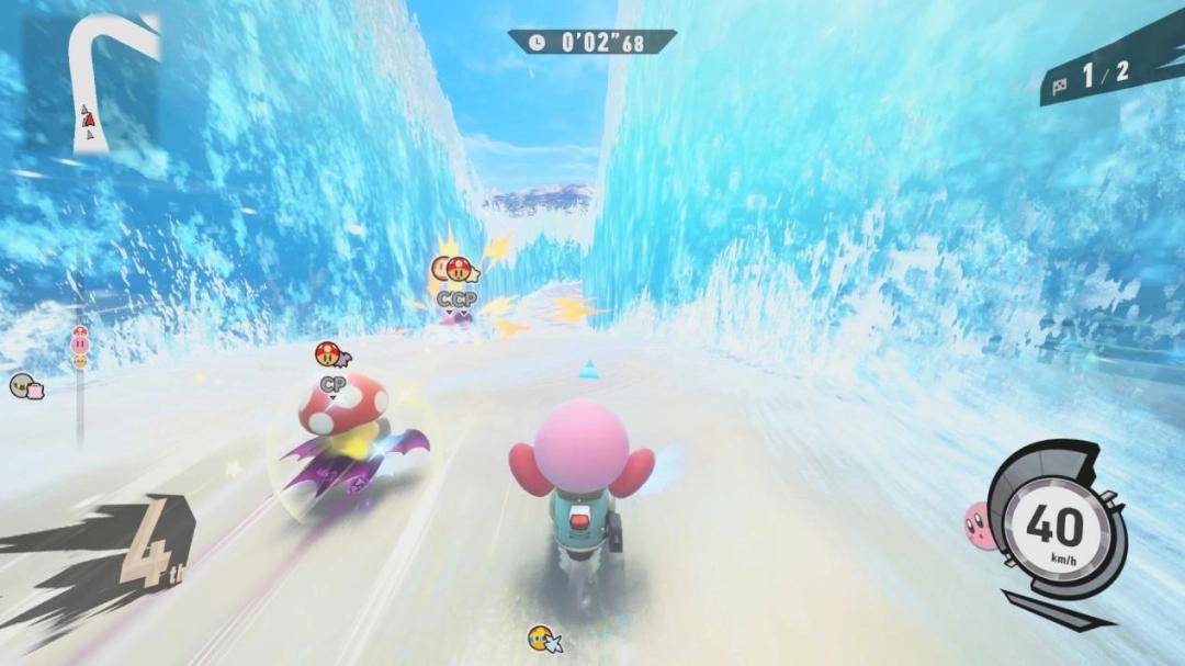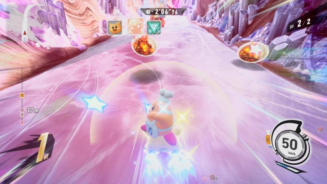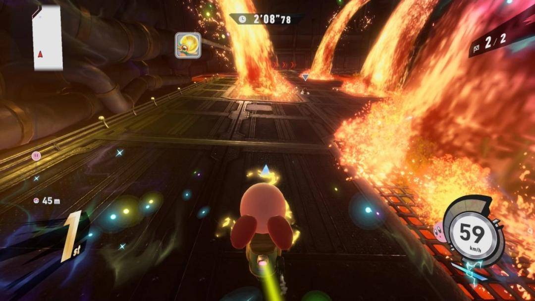 上述这些,还只是本作中“B键”的其中一个用法——别忘了,这不仅是一款竞速游戏,更是一款“卡比”游戏,而任何“卡比”游戏都少不了粉色恶魔的战斗爽。