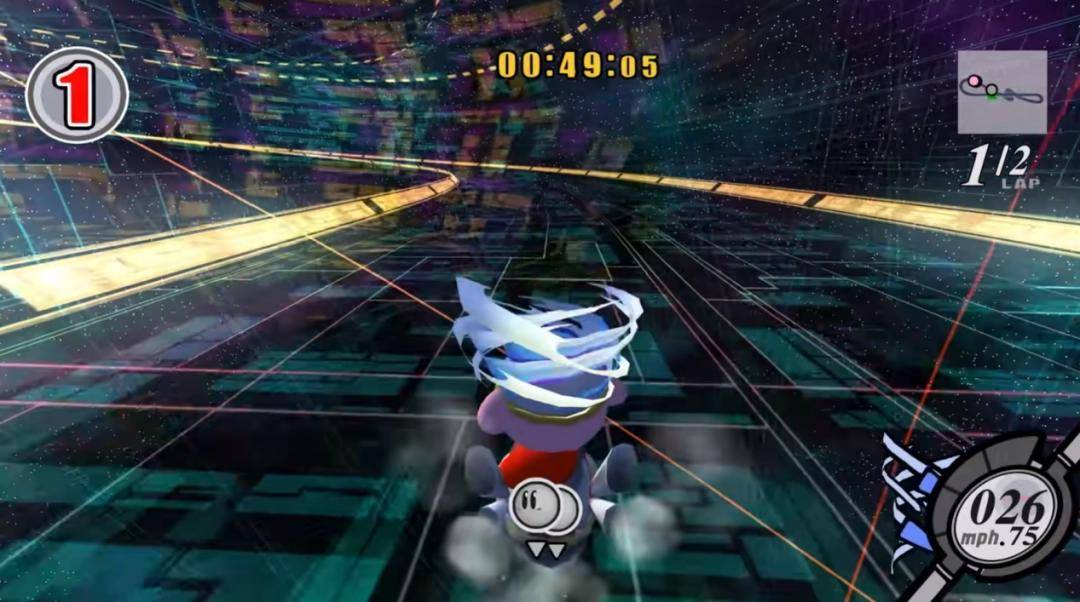 这款竞速游戏连最基本的“油门”键也没有,比赛开始后载具便会进行全自动加速,仅有的B键则承担了载具与赛道元素间的全部互动,包括但不限于急停刹车、蓄力喷射、吸入攻击、使用道具、空中速降……茴字的写法,都没有B键的用法多。