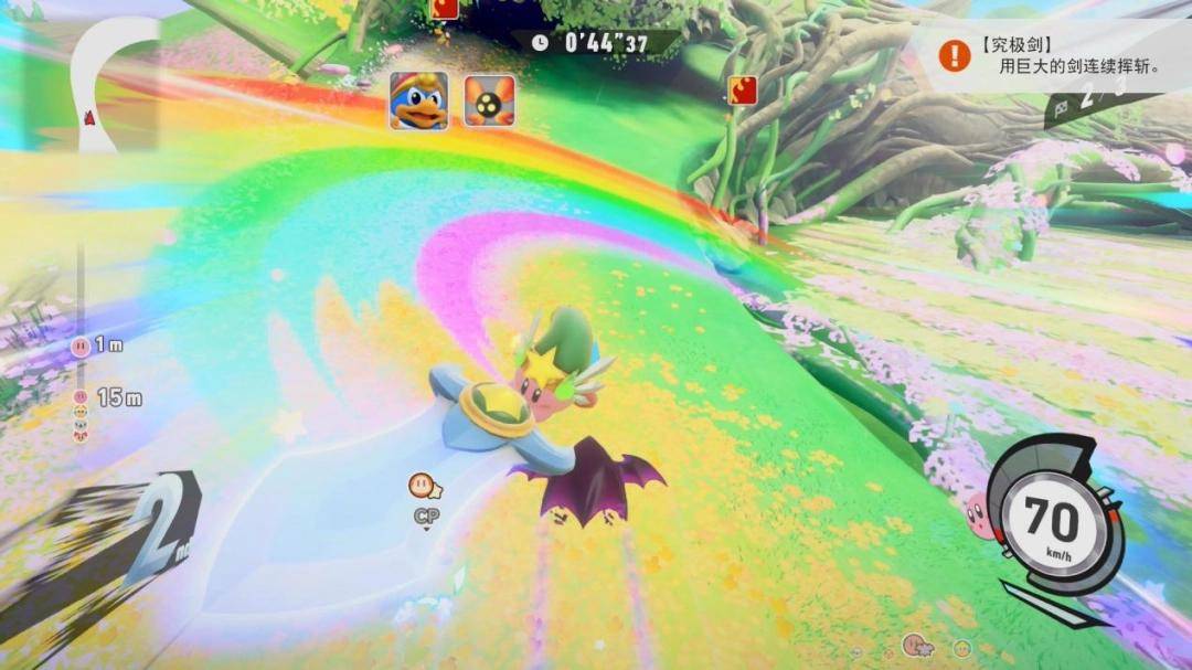 在比赛中,玩家速度表下方的必杀技计量槽,会随着时间和击败杂兵而逐渐累积,一旦充满就能在有限的时间内,使出拥有夸张视觉效果必杀技。以默认角色卡比为例,他的大招就是掏出《星之卡比重返梦幻岛》中的超级大剑,在获取加速的同时,将面前极大范围内的对手统统砍飞。