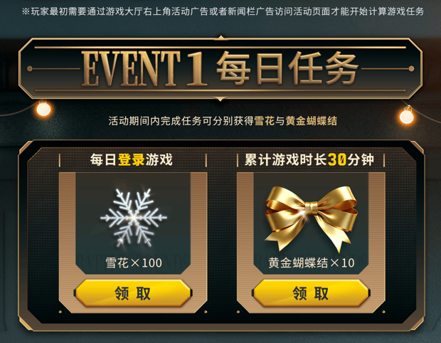 活动1:每日任务 ,活动期间内完成每日登录及时长任务即可获得活动道具“雪花”和“黄金蝴蝶结”;