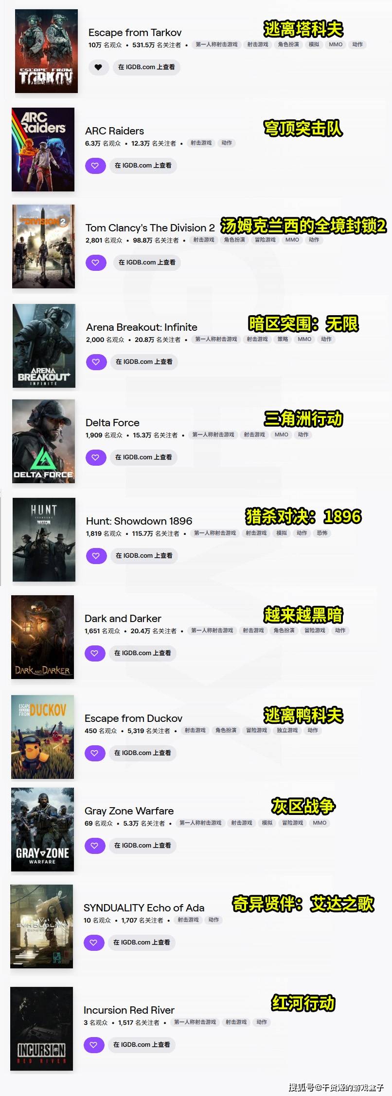下面附上各个搜刮撤离类游戏当前在老鼠台的热度,以及由PCGAMER编辑—埃莉・古尔德顿带来《Arc Raiders》评测文的译文: