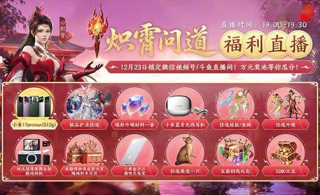 “炽霄问道”资料片嘉年华开启,各位少侠不仅可以在游戏内参与新版本各项活动,也可以在【炽霄问道直播盛典】抽取多重豪华大奖!参与游戏内日常活动获得兑换材料,集齐后兑换好礼有机会获得直播抽奖券、护法招募券、红包兑换等。拥有抽奖券的少侠可参与官方直播间活动,小米17pro max、小米无线耳机Buds 5 Pro、柯达超薄便携相机、成都博物馆皮影积木日历、小米金沙江磁吸充电宝、任选在售外观等绝品大礼等你抽取!