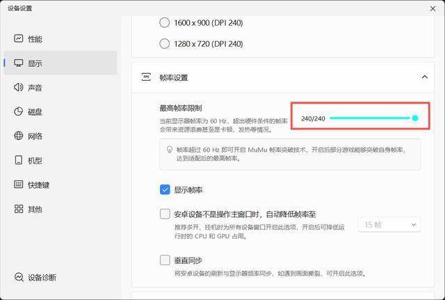 显示设置开启 240 帧,关闭自动降帧与垂直同步;机型设为华为 Mate 50 Pro,GPU 选高配,助你畅享高帧稳定对战!