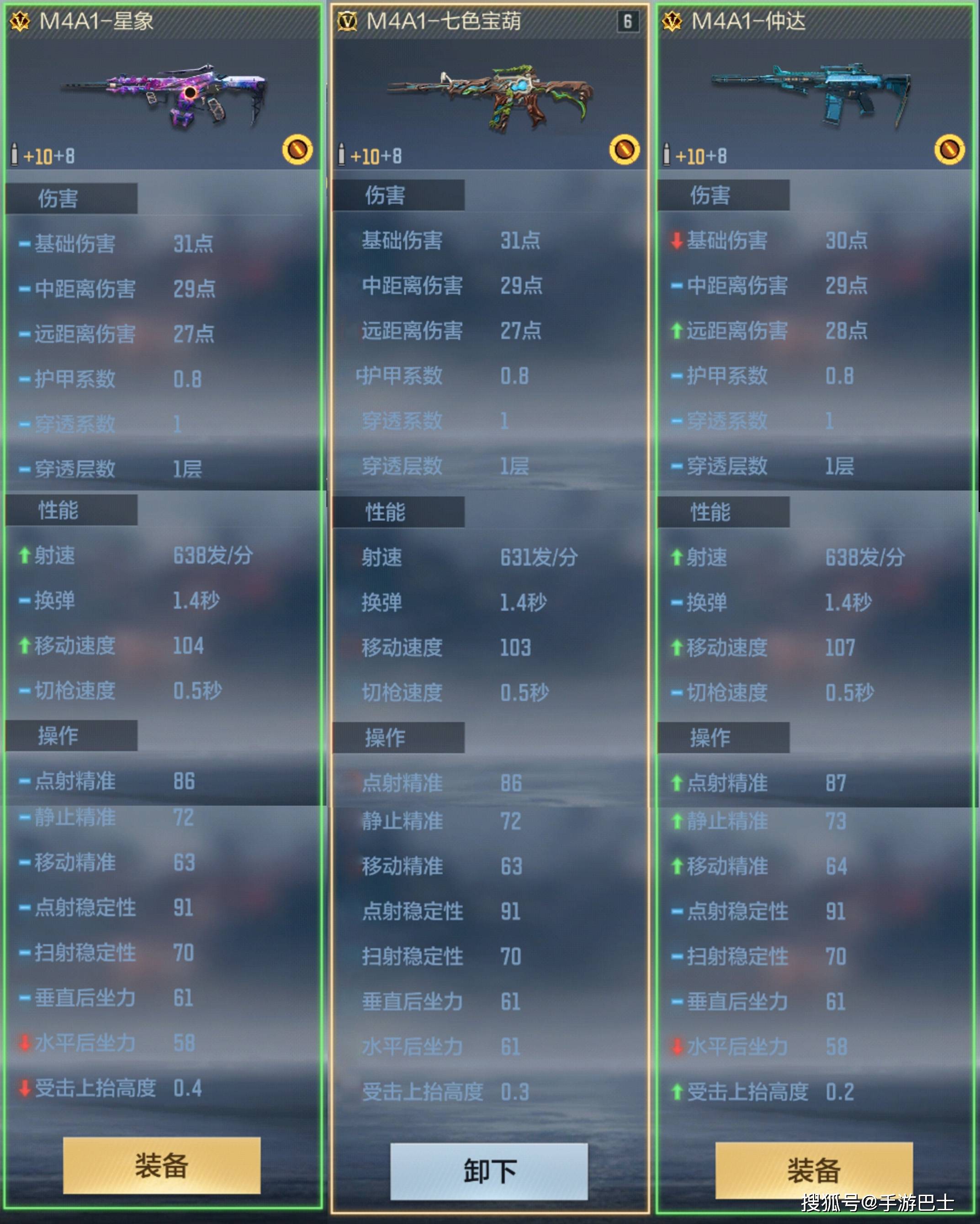 M4A1-七色宝葫的基础伤害略高于M4A1-仲达,但是M4A1-仲达拥有距离衰减优化,两者在伤害方面不分伯仲。M4A1-仲达的整体弹道优于M4A1-七色宝葫,并且还有略强一点的受击上抬优化。