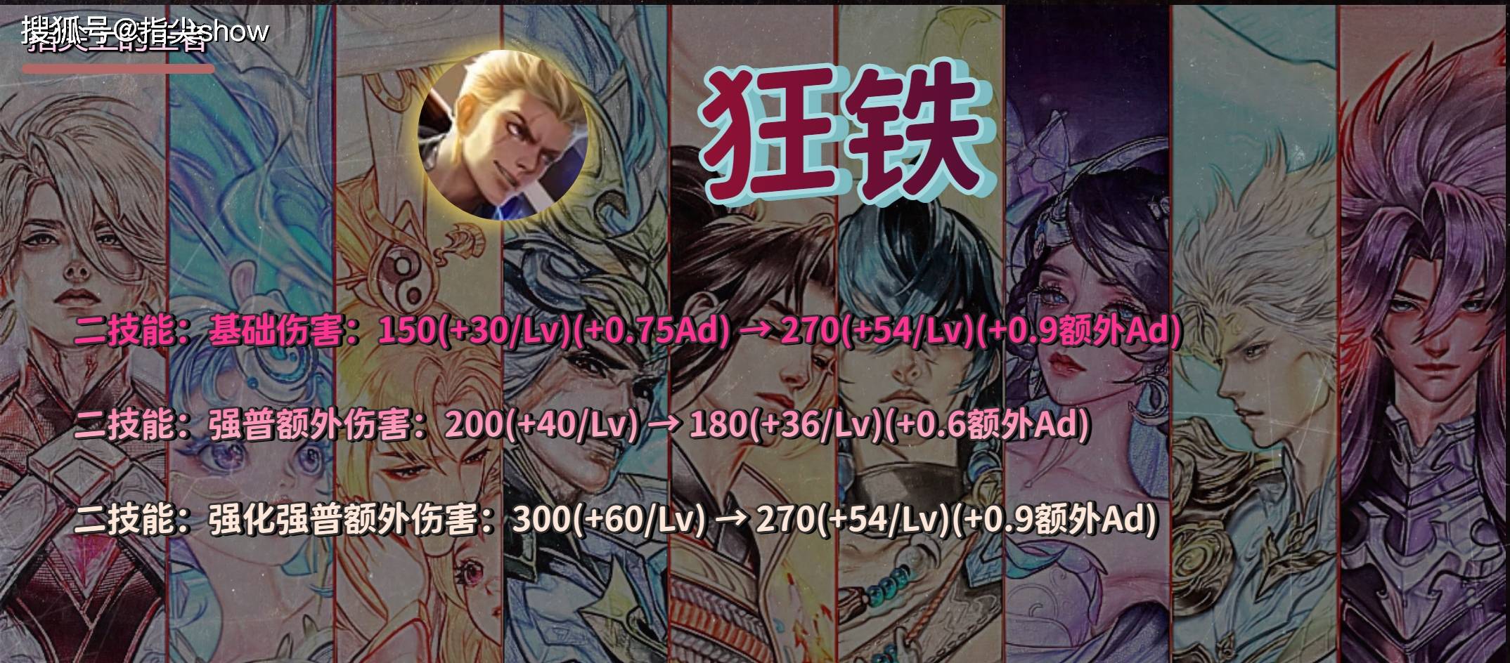 这一点和一技能的调整方向刚好相反,其实正如我昨天跟大家分享的看法一样,将狂铁的属性均摊,1技能的伤害和2技能平衡,大招和1技能的坦度进行平衡。