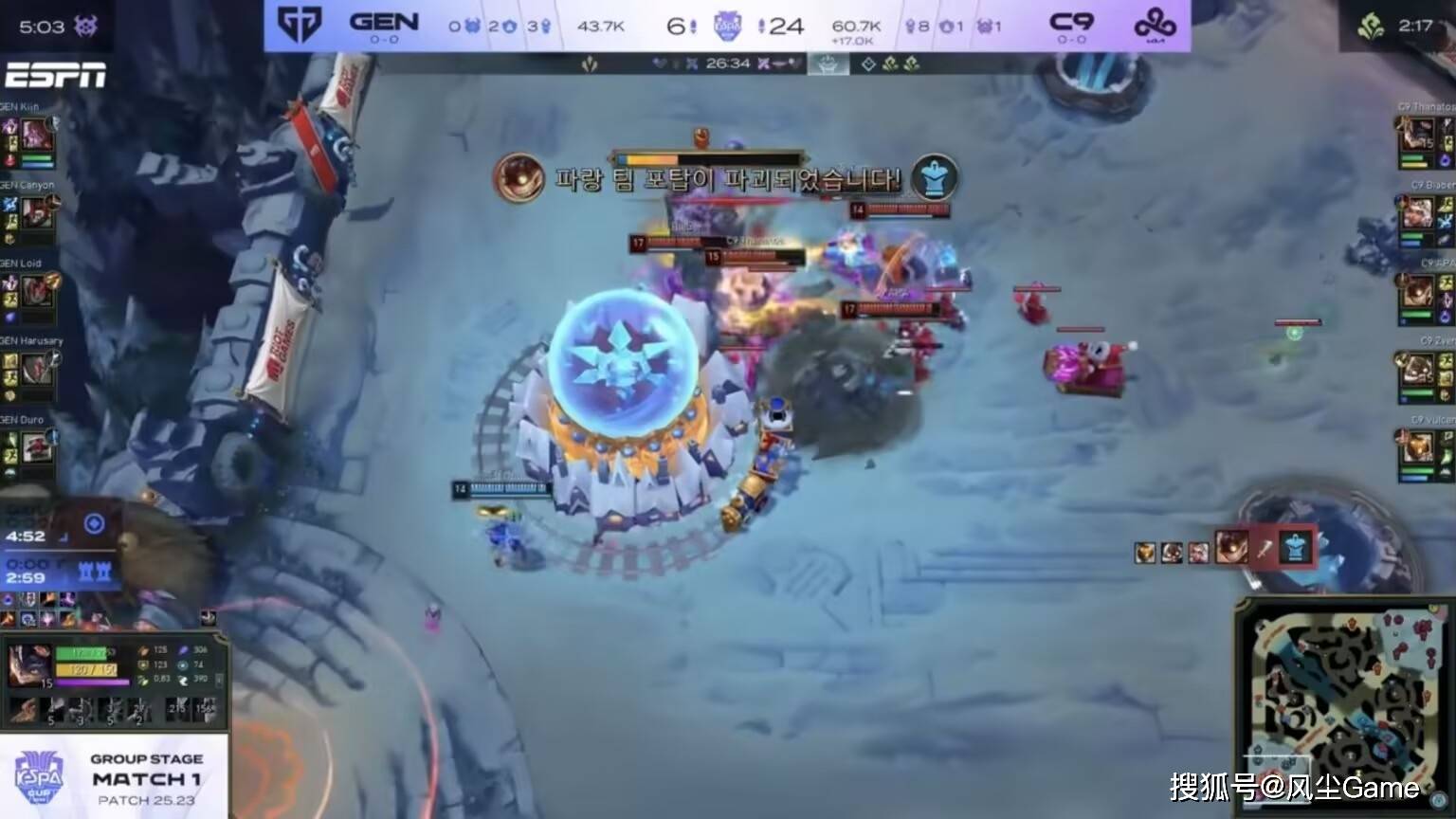 第二把对战C9,两队前期都很谨慎,比赛8分钟才爆发一血,GEN下路打出线杀,但随后中单就被抓送了一个,后续打了很多小规模团战,C9每次都大获全胜,仅仅20分钟,GEN人头比就来到6:12,经济落后7.3K,和上一局一样,打团GEN依旧打不过,24分钟被0换5后,比赛失去悬念。