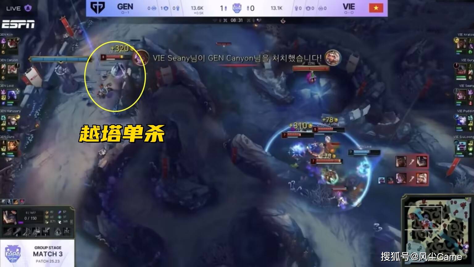 简单看看,GEN这两场比赛,是怎么输的吧,第一把打MVKE,三叔前期抓下,拿到了对面AD的一血,但8分钟的巢虫团,Kiin出问题了,他玩的兰博,被越南奎桑提越塔单杀,中野辅正面3打3,打野和辅助全部阵亡,不到9分钟GEN人头就1:3比落后,后续三叔抓了几波人,但没有资源。