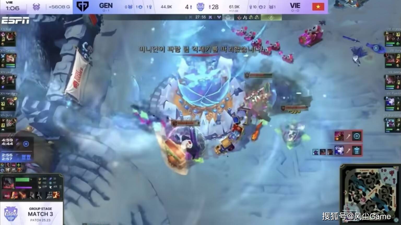 MVKE巢虫、小龙资源全拿,才25分钟越南队就收获龙魂,团战MVKE也是一边倒,只要接就赢,GEN毫无还手之力,被打得节节败退,比赛28分钟结束,GEN一共只拿到4个头,而MVKE打出了28个击杀,这已经是绝对的人机局了,没了主力双C的GEN,上野辅好像有点原形毕露。