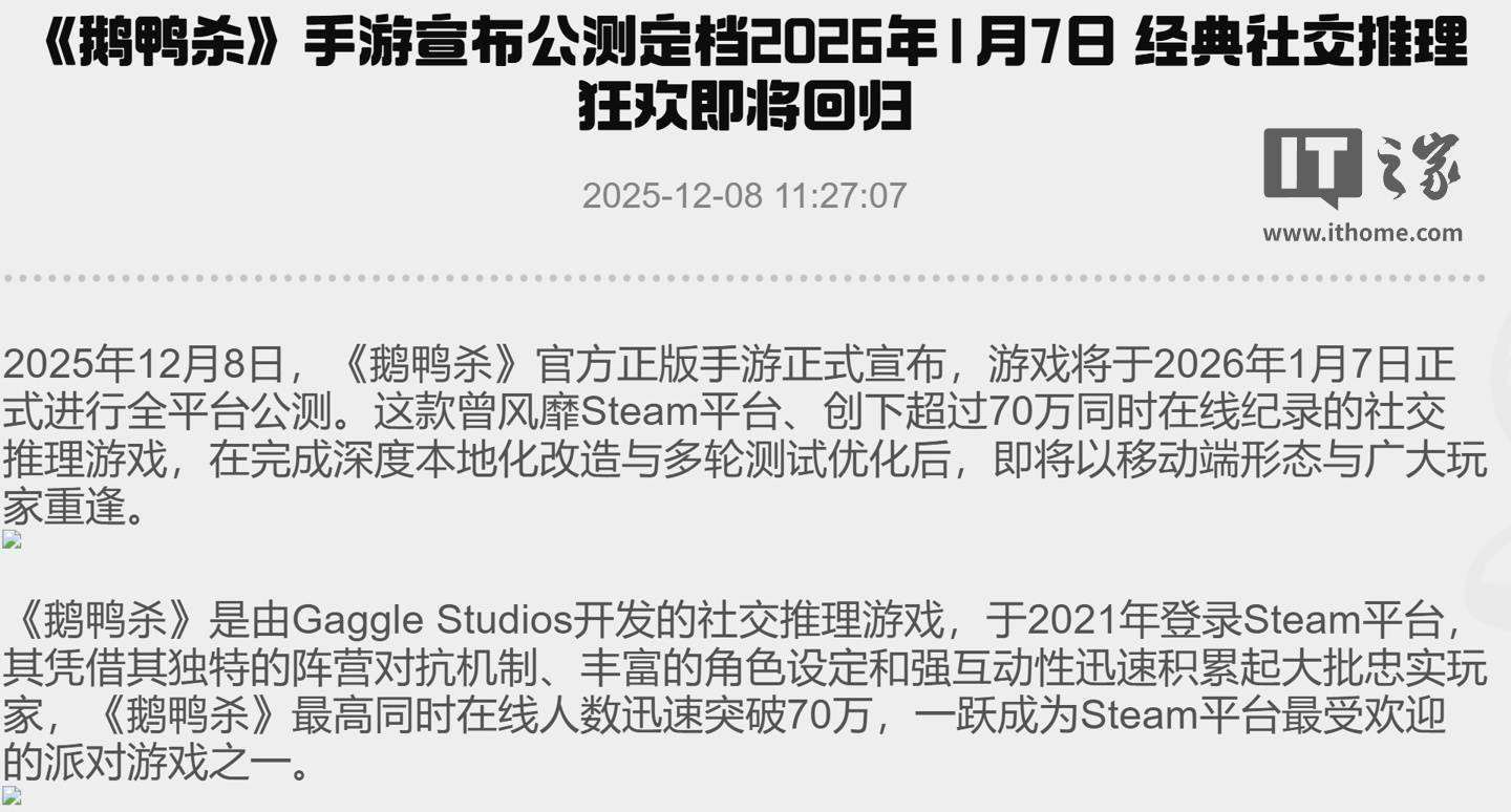 IT之家 12 月 8 日消息,《鹅鸭杀》手游今天宣布国服公测定档 2026 年 1 月 7 日,将由金山世游运营。