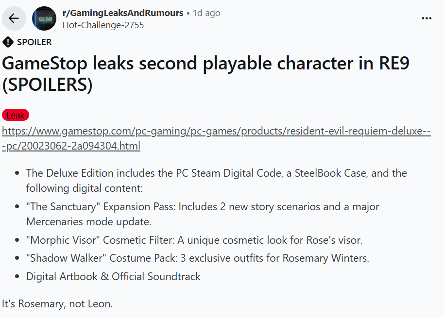 据悉,在GameStop的官网上,最近有人在发现生化9豪华版的内容列表中,除主角格蕾丝外,还有萝丝玛丽的两套服装,很快GameStop删除了所有相关信息。