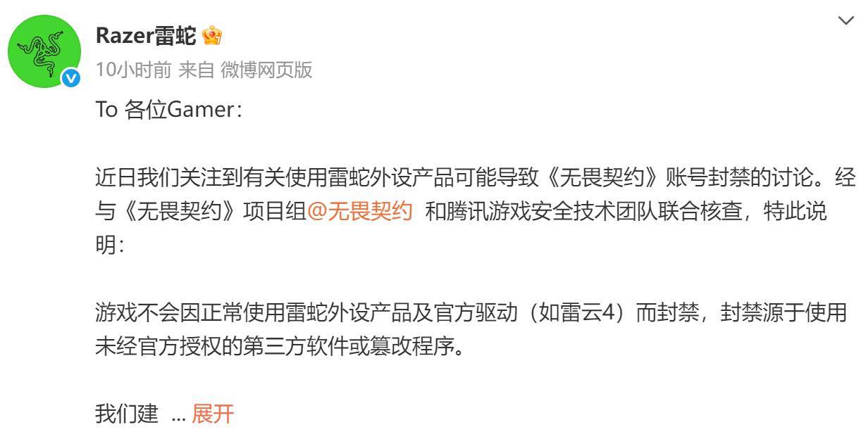 雷蛇表示,“近日我们关注到有关使用雷蛇外设产品可能导致《无畏契约》账号封禁的讨论。经与《无畏契约》项目组和腾讯游戏安全技术团队联合核查,游戏不会因正常使用雷蛇外设产品及官方驱动(如雷云4)而封禁,封禁源于使用未经官方授权的第三方软件或篡改程序”。