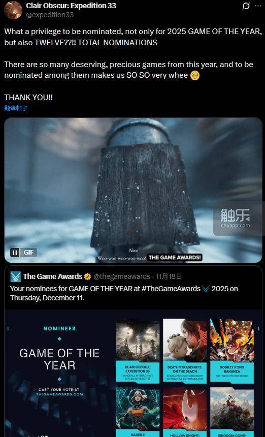 《光与影:33号远征队》官方因被TGA提名12项奖项而表示感谢