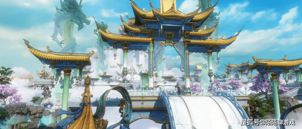 天宫楼阁四周被云雾轻裹,脚下是白玉般的阶梯与廊桥,桥边点缀着粉紫花树,柔美的花色中和了建筑的庄严感。远处隐约可见更多琼楼玉宇,更添缥缈仙气。