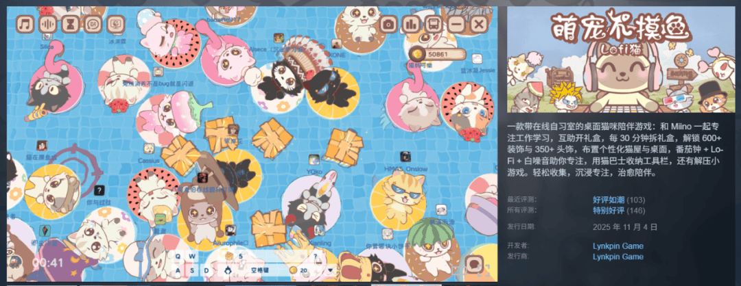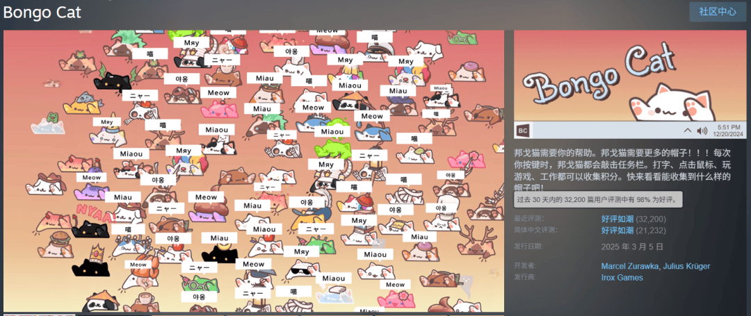今年3月份,爆火的免费软件《Bongo Cat》的同时在线一度高达19.4万,更是证明了这批用户在Steam的活跃。桌面软件和桌面游戏不分家,前者的兴起,很大程度上给桌面放置游戏做了预热,提供了稳固且可观的用户基础。