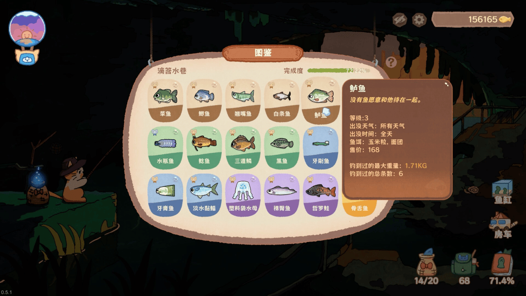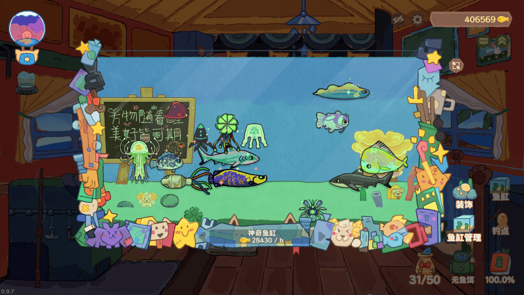 开头提到的《猫猫钓游记》就属于第一个分支,制作一个Q萌的猫猫钓鱼场景,配合大量的鱼类图鉴和出货条件、一定的升级路线,就能构建一个非常杀时间的桌面放置玩法。