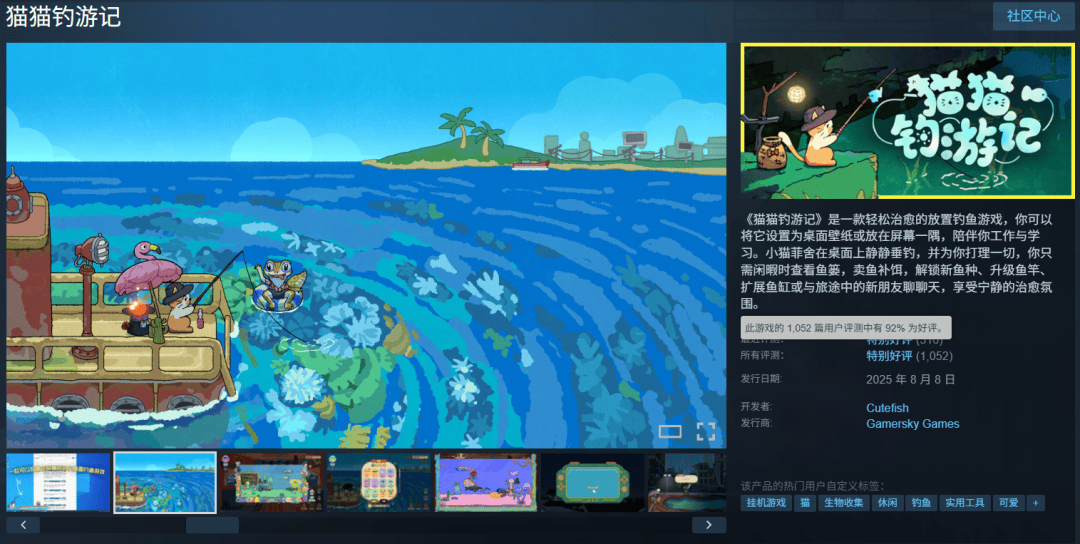 说来《猫猫钓游记》并不是什么大作,也没太大名气,如今在Steam仅有1千来条评论,不过好评率确实不错,有92%,妥妥小众佳作一枚。