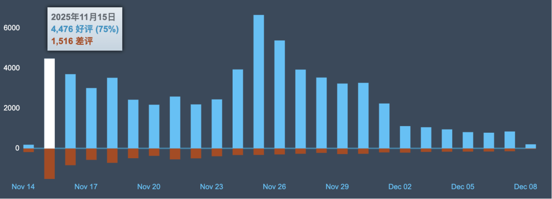 11 月 15 日,游戏好评率为 75%,经过了几天的发酵之后,游戏评价开始逐渐上涨。