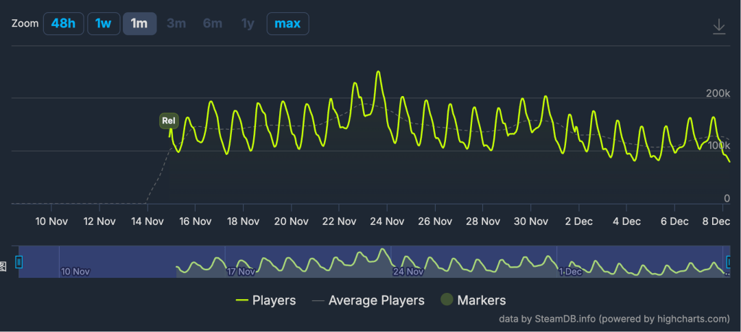 是的,《燕云十六声》在 11 月 15 日全球上线后,在半个月的时间里,拥有超过 900 万外国玩家,Steam 好评率 86%,同时在线玩家数呈现出一条漂亮的曲线,每天最高能有十多万人同时在线。。。