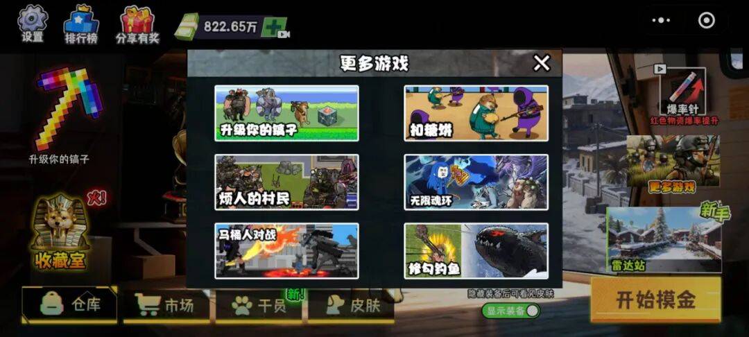 而在外围玩法方面,该游戏也采用了最粗暴的方式来提升内容丰富度,就是在摸金主线之外,增加了“升级你的镐子”、益智游戏“抠糖饼”、PVP“烦人的村民”、“修勾钓鱼”等多种不同的玩法。