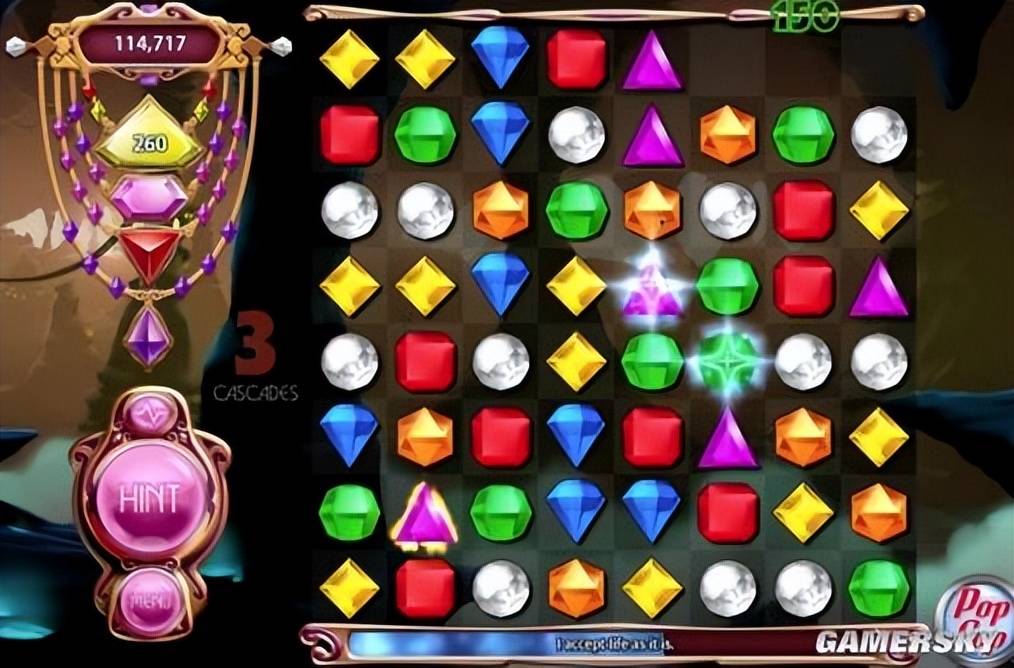 以经典作品《宝石迷阵》为例:玩家通过互换相邻宝石的位置来形成三个或以上相同颜色的直线,从而触发消除并获得分数,并以此构成进入下一关的具体标准。这种“两两交换,同色消除,连锁反应”的简明逻辑与操作,也同样成为了适应各年龄段的休闲玩法代表。