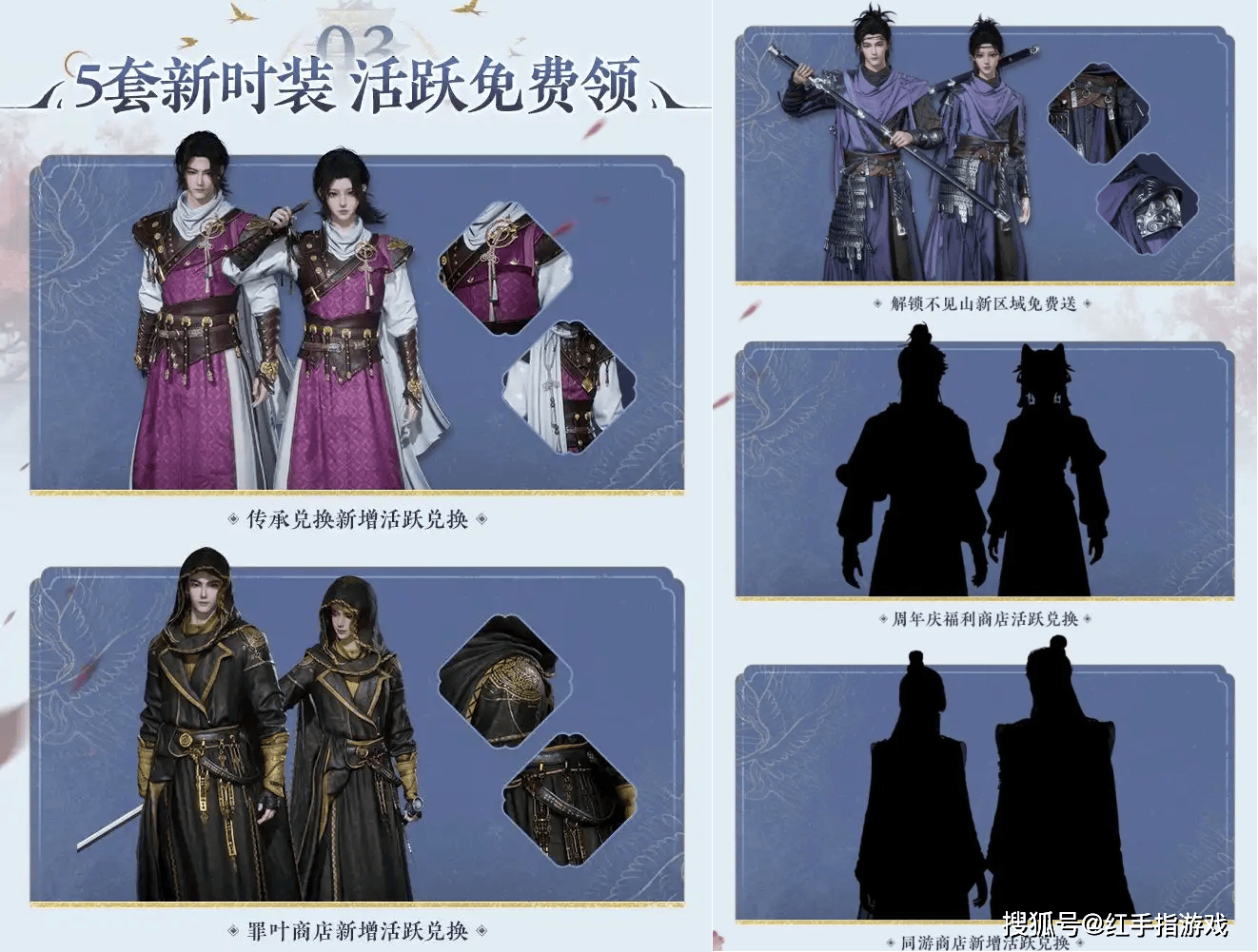 分别可以通过传承兑换、罪叶商店、周年庆福利商店、同游商店的新增活跃兑换,还有一套可以通过解锁不见山新区域免费送: