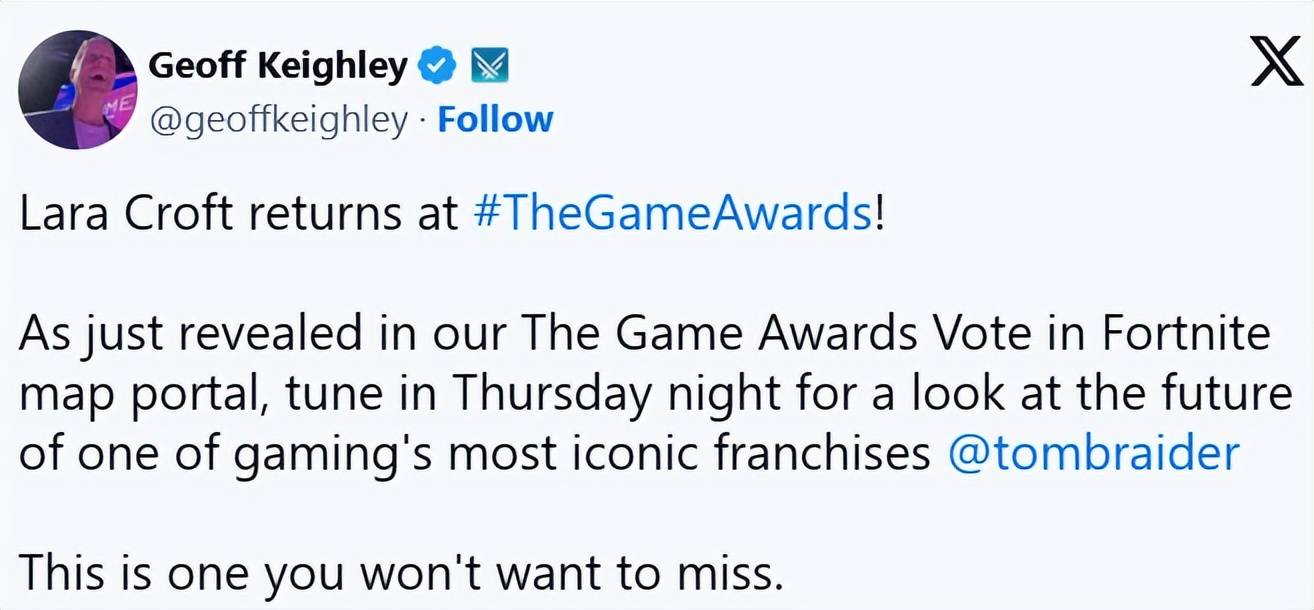 《古墓丽影》系列将在本周四举行的TGA颁奖典礼上正式归来,TGA的创始人兼主持人Geoff Keighley在社媒上发布消息。