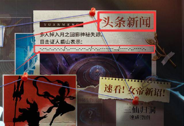 从图中可以明显的看到,有裴擒虎、空空儿、哪吒、杨戬、公孙离、海月、李元芳等英雄的相关线索,但答案一般不会这么普通且模糊,必定会有100%可以确定人选的专属线索。而图中的头条新闻是最显目的存在,同时目击证人盾山说了一段神秘代码的话,经常看谍战剧的玩家就知道,这分明是摩斯密码,经过翻译可得四个汉字:太、乙、司、空,所以这源梦皮肤的人选明显就是太乙真人和司空震了。