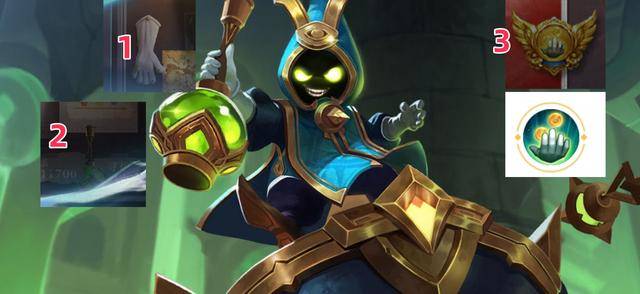 再根据图中的其他线索来侧面验证一下太乙真人:1、图1左上角的白色手套属于太乙真人;2、图1右下角的药瓶属于太乙真人;3、图1中鬼火少年海报右侧的图标是太乙真人的被动(黄金闪闪)。