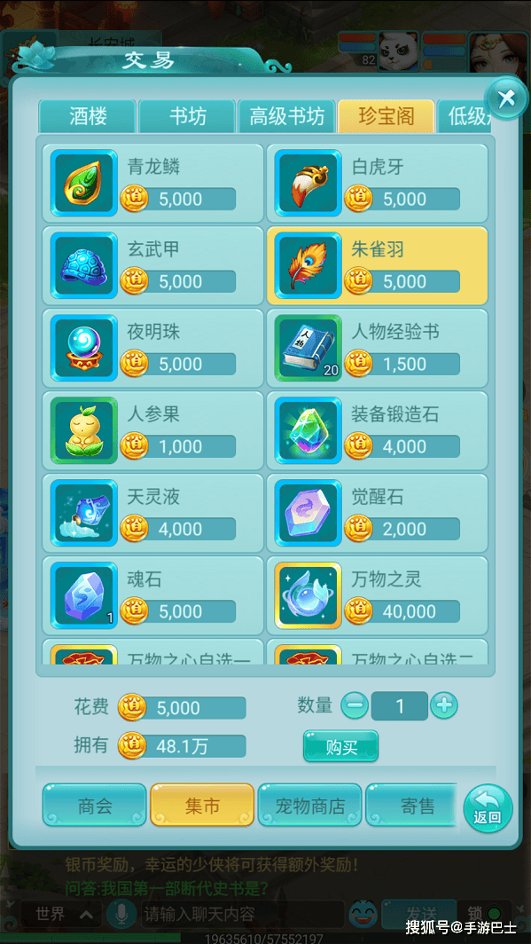 获取逍遥宝图最常规的方式,是集齐青龙鳞、白虎牙、朱雀羽、玄武甲、夜明珠这“逍遥五宝”。少侠可在集市的珍宝阁直接购买,每件仅需5000金币,这意味着每张宝图的基准成本约为25000金币。只要能挖出价值高于此的宝物,便是稳赚不赔。