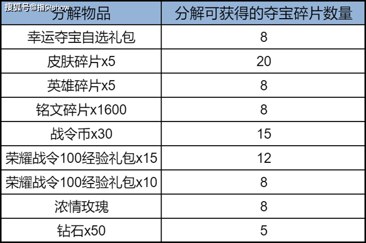 分解的内容可以参考上图,除了英雄、皮肤和荣耀水晶,你抽到的一切道具都可以分解,最值钱的就是皮肤碎片*5了,可以分解20个夺宝碎片,只是不知道换一个个性资源需要多少。