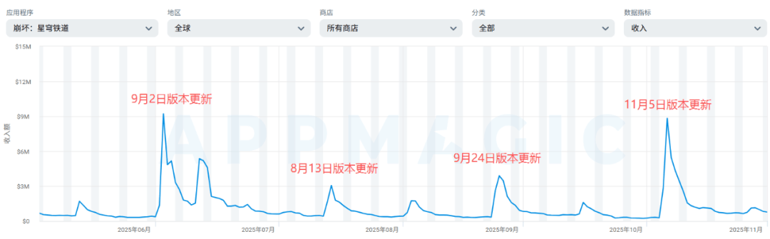 TOP10到TOP30区间,多款上线多年的老牌游戏通过内容更新与活动运营,实现收入显著回升。例如《崩坏:星穹铁道》在11月5日推出大型版本更新及限定角色,带动单日全球分成后收入达882万美元,创下半年第二高,仅次于7月2日的920万美元。该游戏近半年保持约40天一更新的节奏,每次更新均伴随收入小高峰。