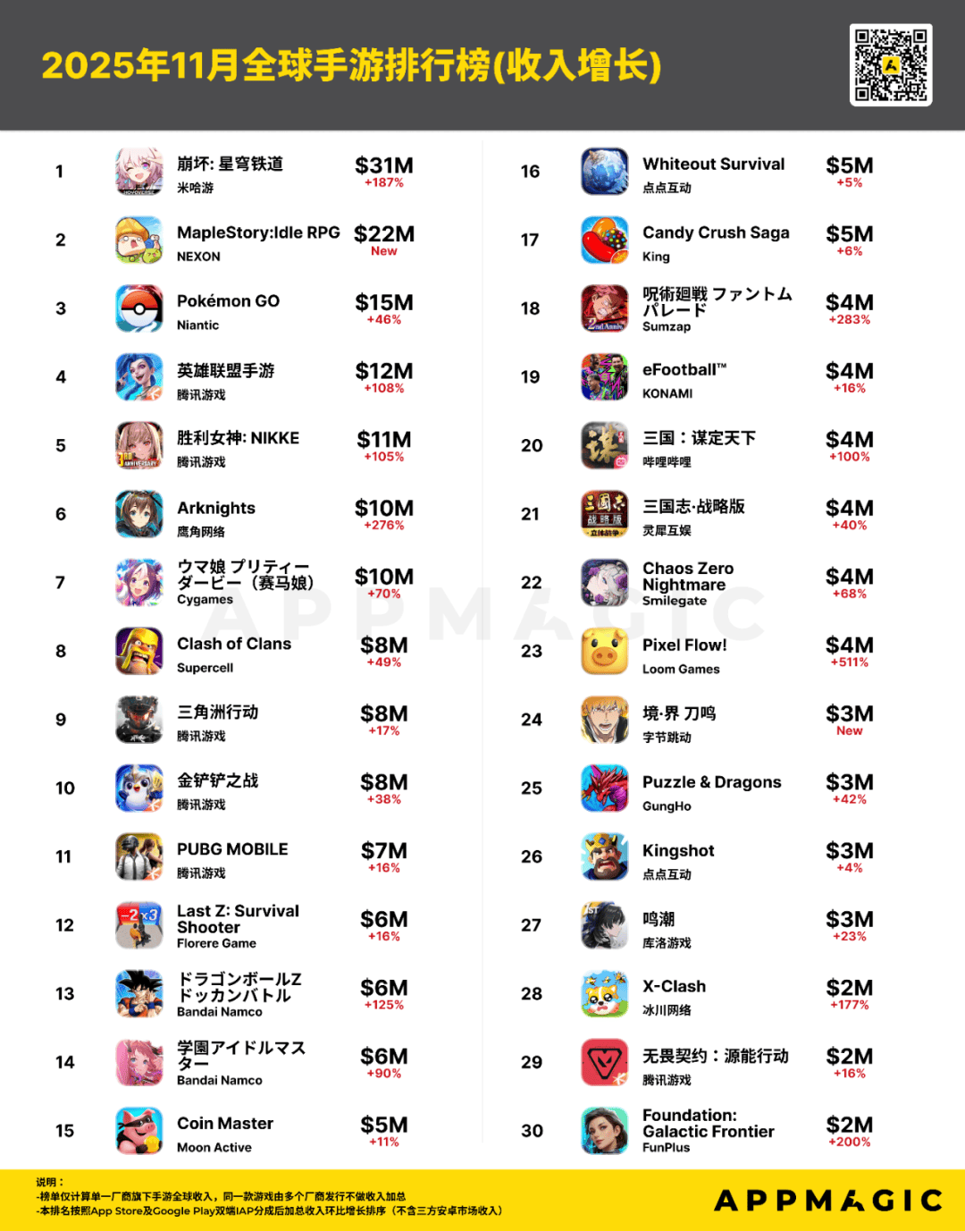 近日,移动应用市场研究机构AppMagic公布了2025年11月的全球手游收入排行榜及下载榜。(注:数据仅基于玩家在App Store和Google Play上的消费所产生的总收入,不包含第三方商店或网页商店数据)