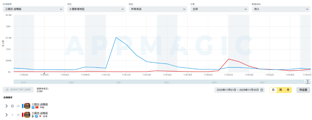 《三国志・战略版》中国大陆和日本市场11月收入表现