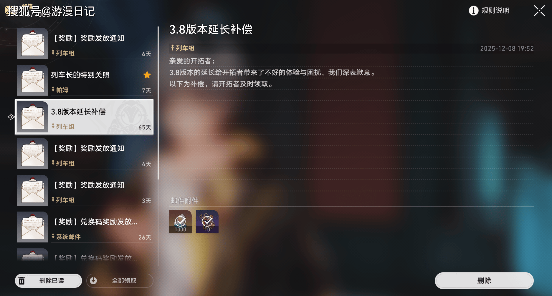 首先是玩家最关心的补偿方面,在宣布3.8版本延长两周后,制作组已于12月8日,向所有开拓者发放了1000星琼和10个燃料的补偿奖励,玩家可直接前往游戏邮箱领取。这波实打实的福利,算是给翘首以盼新版本的玩家送上了一颗“定心丸”。
