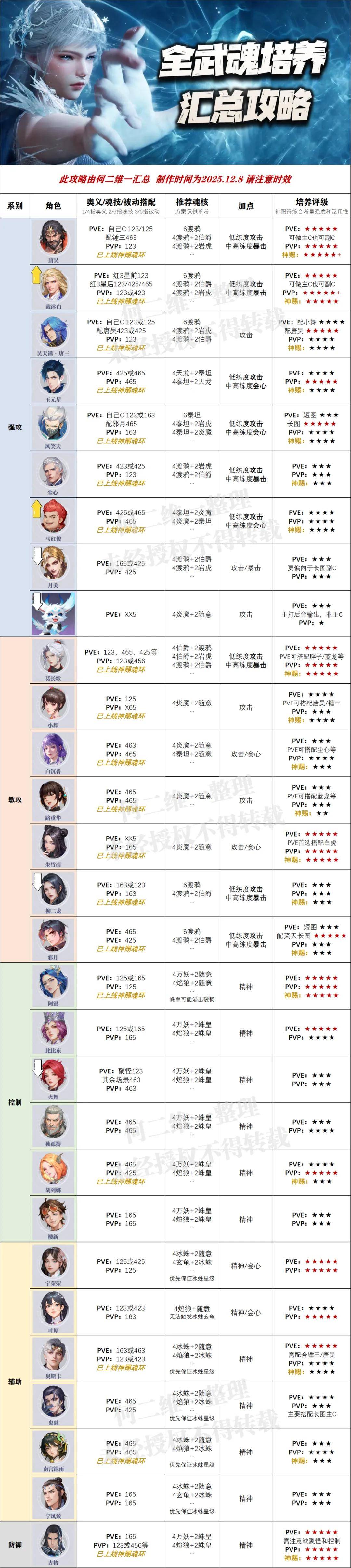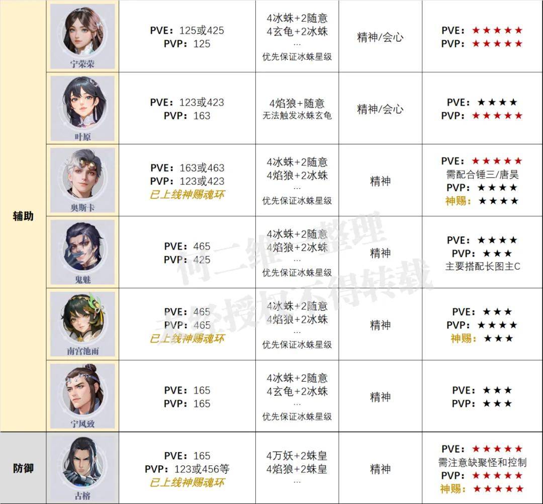最后的辅助和防御就一起说了,目前这两个系别的变化也不大,只是需要特别提一句的便是,宁荣荣目前的全面统治力正在逐步下滑,因为叶原在PVP中的表现似乎已经有点压过了宁荣荣的势头,此外古榕在PVP中也逐步成为了很多朋友的优选武魂,所以从官方近期的限定角色设计思路来看,PVE和PVP双端开花似乎也成为了一个短期内的设计宗旨。