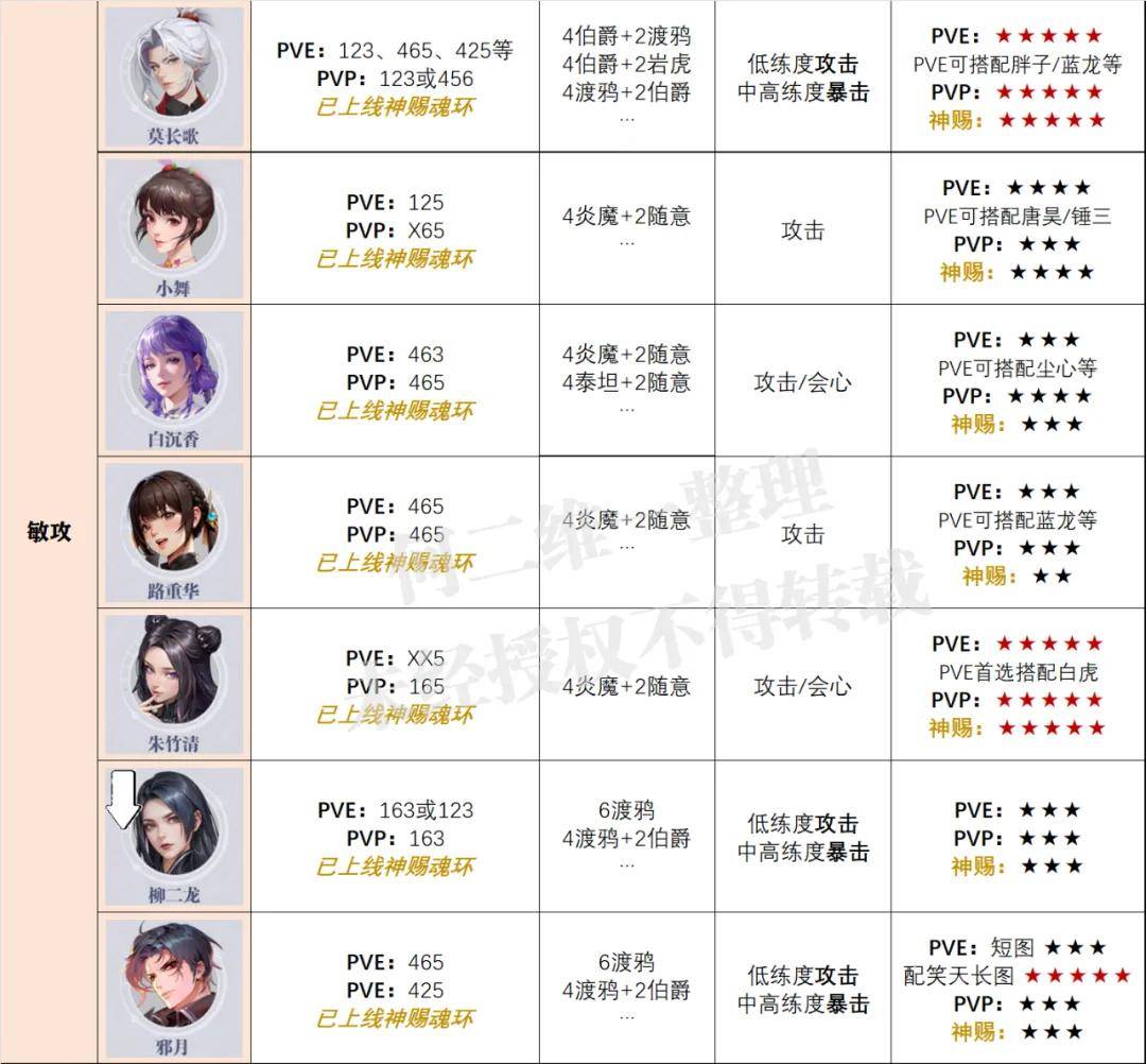 接着则是敏攻系部分,目前全新上线的莫长歌几乎是端端开花的状态,每一个战斗场景都有很不错的表现,甚至在部分战斗场景中还有着近乎人权的表现与发挥,所以暂时这一期维一是给到的PVE和PVP双端5星的评级,当然她这个神赐对其也极为重要,所以这个也得给个5星的获取评级。