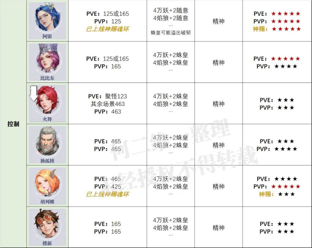 然后是此次版本变化不大的控制位,反正如果走单控(这里暂且把古榕算进来)的话,古榕、阿银和比比东就是目前比较主流的三个选择,而走双控的话则是以阿银+古榕为主,而PVP的话则是阿银一枝独秀......